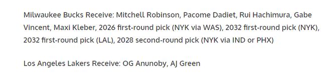 雄鹿得到:米切尔・罗宾逊、帕科姆·达迪耶、八村塁、文森特、马克西・克莱伯,2026年首轮选秀权(尼克斯从奇才获得)、2032年首轮选秀权(尼克斯)、2032年首轮选秀权(湖人)、2028年第二轮选秀权(尼克斯)