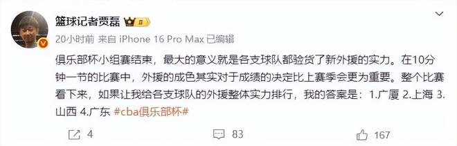 由于新赛季的单节时间缩短为了10分钟,再加上四节七人次的外援政策,不少媒体和球迷都认为,外援才是决定一支球队成绩上限的主要因素。就在日前,北京记者贾磊对新赛季各队的外援实力进行了排名,他认为通过俱乐部杯赛的表现来看,外援实力最强的四支球队分别是广厦男篮、上海男篮、山西男篮和广东男篮。