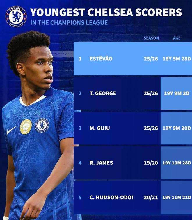 切尔西欧冠最年轻进球者前5:埃斯特旺、乔治、吉乌位居前3位