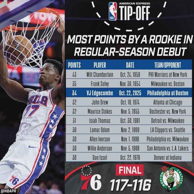费城117-116险胜凯尔特人,马克西41分钟里砍下40分6助,新科探花秀埃奇库姆42分钟里砸出34分7板3助尽显天赋;对面的杰伦布朗,首次单核带队的他,25分6板4助进账。