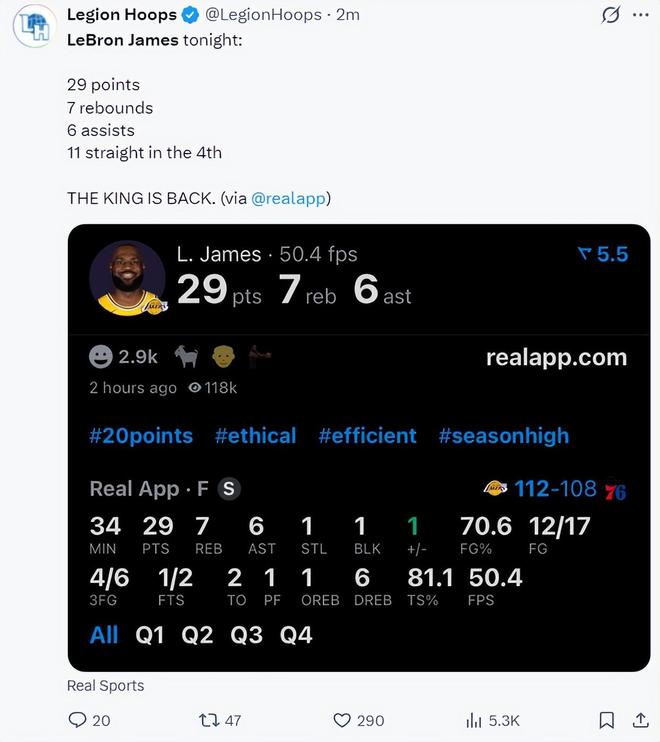 北京时间12月8日,湖人以112-108逆转费城。这场比赛即将年满41岁的勒布朗-詹姆斯复出了,他对阵猛龙一战17中4+三分5中0但传出了绝杀助攻,他1297场连续上双的纪录中断了,他的生涯进入另一个阶段,可此役老詹一反常态打出高效、全面的表现,全场比赛29+7+6+1+1,末节12分连中关键球+绝杀抢断。