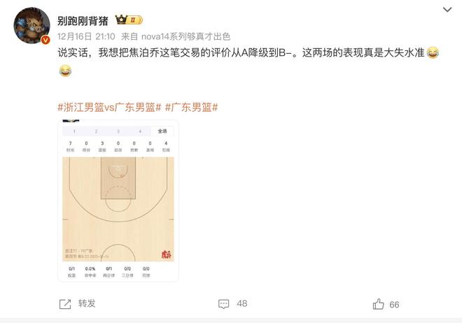 因为按照广东男篮目前的整体阵容实力,他们是具备冲冠实力的。结果前两场比赛打得如此难舍难分,又怎么能够让球迷相信他们能够在后续的比赛可以获得更好的成绩呢?而且大家也知道,通过最近两场比赛,原本被寄予厚望的24岁国家队锋线焦泊乔的整体表现非常糟糕,也让不少媒体人直呼失望。再这样打下去,焦泊乔真的有可能成为了大番薯。