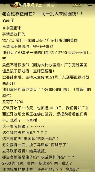 事情经过是这样的,有球迷携一家四口于本月17日,总共花了2700元买了四张门票,看了广东男篮对阵一支来自美国球队的比赛,他们看到广东男篮大获全胜很开心。然后,他们又买了21日广东男篮对阵来自西班牙的一支球队比赛的门票。