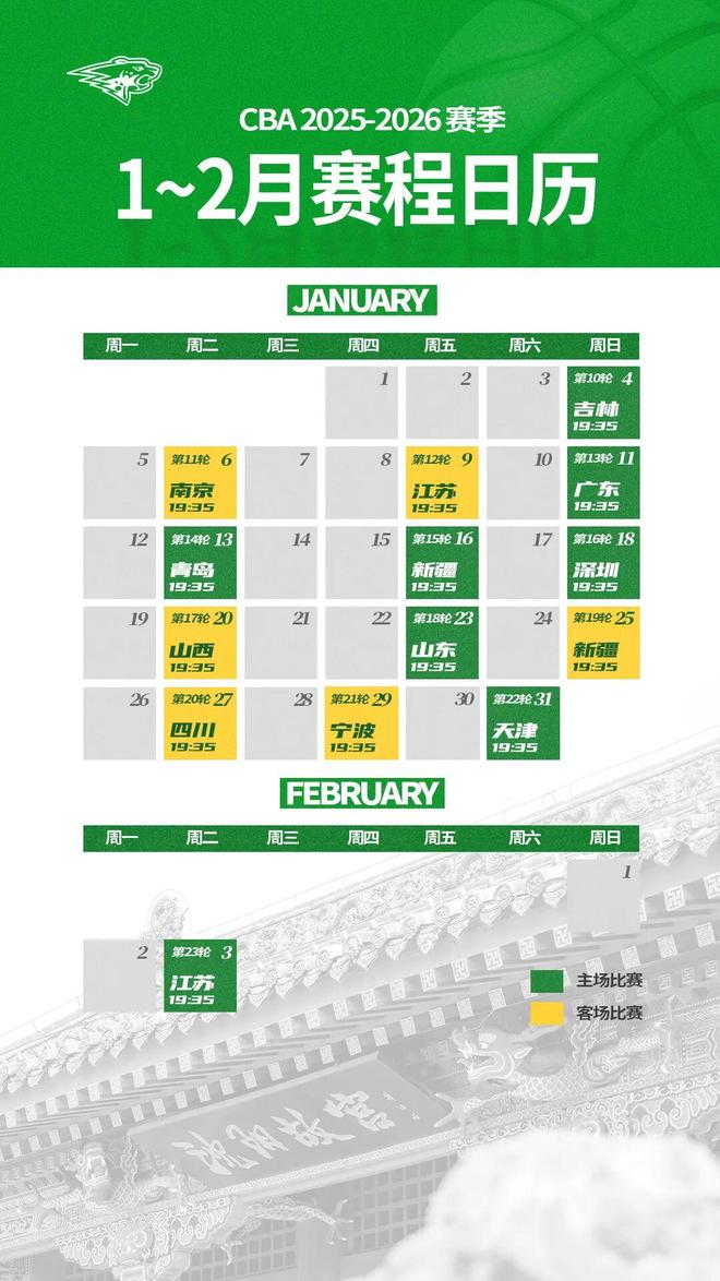 2025-2026赛季CBA常规赛赛程已经公布,辽宁本钢队首轮将于12月13日客场挑战天津队,第一个主场比赛日是12月15日,对手是卫冕冠军浙江广厦队。