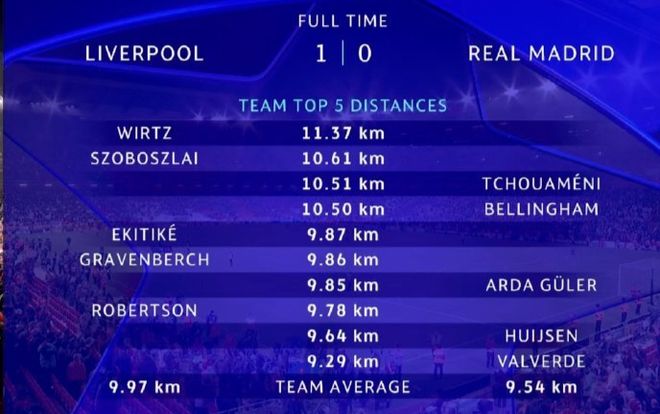 根据赛后统计,维尔茨狂跑了11.37公里,贡献了5次关键传球,创造了1粒进球机会,2次过人全部成功。维尔茨也成为利物浦历史上首位在欧冠前四场比赛中,创造机会数最多的球员 。