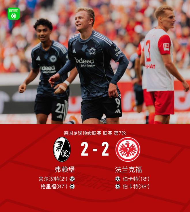 北京时间10月19日,德甲联赛第7轮,弗赖堡坐镇主场迎战法兰克福。上半场,曼赞比送出助攻,舍尔汉特闪击破门为弗赖堡先拔头筹。随后,伯卡特梅开二度反超比分;下半场,替补登场的格里福任意球直接破门绝平比分。最终,双方2-2握手言和。