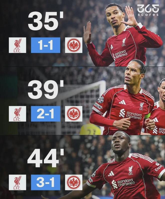 尽管利物浦又是率先丢球的一方,但是他们并没有自乱阵脚,通过防守反击由埃基蒂克扳平比分,随后范戴克、科纳特分别头球破门得分,利物浦半场实现反超。
