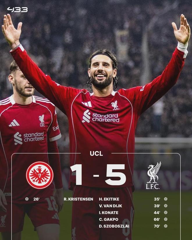 易边再战,维尔茨助攻上演梅开二度,加克波、索博斯洛伊成为了受益者,最终,利物浦在客场5-1逆转击败法兰克福,终结了连败!
