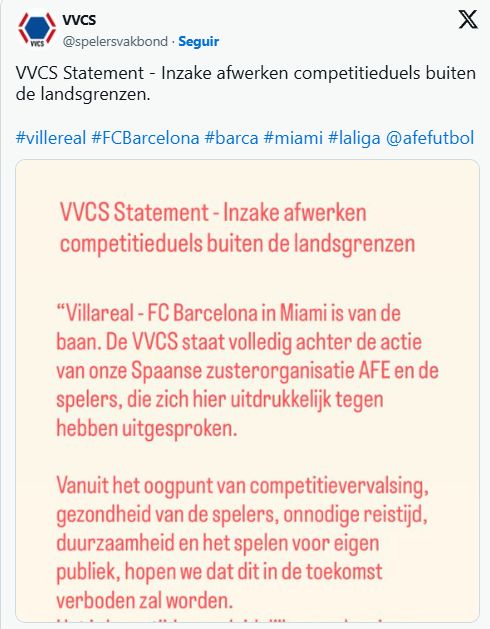 雷速体育10月23日讯 此前西班牙足协提议举办黄潜vs巴萨的西甲海外联赛,在遭到多方的反对后取消,今天荷兰足球运动员联盟公开发文表示抵制。