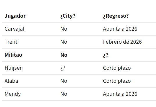 在一线队的10名后卫里,6人因伤缺席,包括卡瓦哈尔、阿诺德、米利唐、怀森、阿拉巴以及门迪。其中,卡瓦哈尔、阿诺德、门迪直到2026年才能复出,米利唐也有可能因伤缺席3个月。