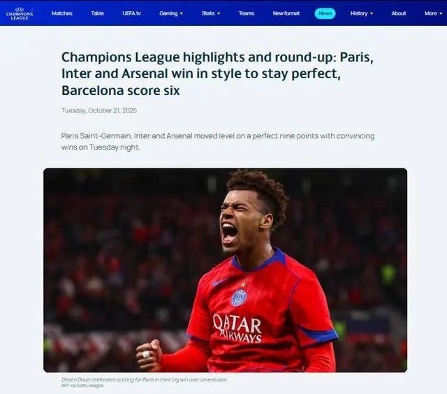 欧足联官网对这个比赛日的报道截图。然而,这张红牌激发“大巴黎”斗志,他们在半场结束前连入三球,又在下半场再进三球,其中前锋埃杜打入两球,克瓦拉茨赫利亚、努诺·门德斯、登贝莱、维蒂尼亚各入一球。勒沃库森队则由罚入点球的阿莱士·加西亚打入挽回颜面的一球。