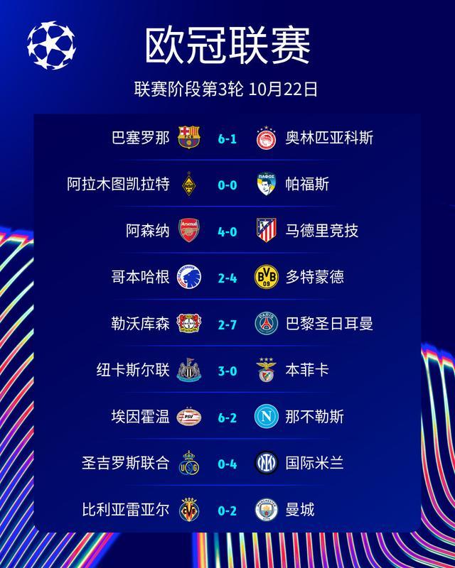 巴塞罗那6-1奥林匹亚科斯、阿拉木图凯拉特0-0帕福斯、阿森纳4-0马德里竞技、哥本哈根2-4多特蒙德、勒沃库森2-7巴黎圣日耳曼、纽卡斯尔联3-0本菲卡、PSV埃因霍温6-2那不勒斯、圣吉罗斯联合0-4国际米兰、比利亚雷亚尔0-2曼城!