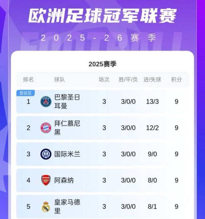 而在欧冠第 3 轮战罢后,包括阿森纳在内,法甲的巴黎、德甲的拜仁、意甲的国米以及西甲的皇马,共有 5 支球队以 3 轮全胜、积 9 分的成绩领跑各自小组,阿森纳能跻身其中,也印证了其在欧冠赛场的竞争力。