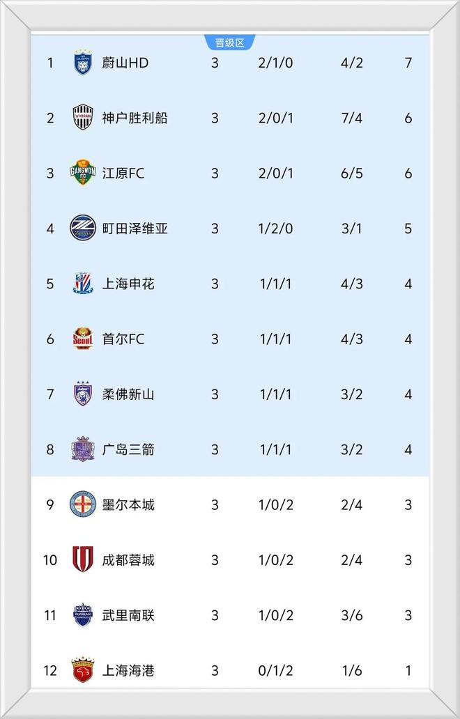 榜首依然是蔚山HD,积7分;神户胜利船和江原FC都是积6分,位列二三位。