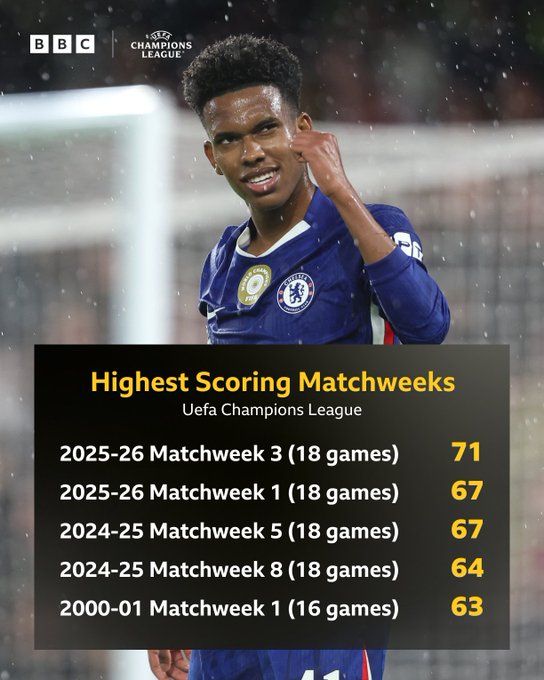 在本轮的比赛里疯狂进球的比赛,包括巴塞罗那6-1狂胜奥林匹亚科斯、埃因霍温6-2逆转那不勒斯、巴黎圣日耳曼7-2狂胜勒沃库森、多特蒙德4-2逆转哥本哈根、切尔西5-1大胜阿贾克斯,以及利物浦5-1逆转法兰克福等较量,一轮比赛出现如此之多进球盛宴,放在欧冠历史上,也成为相当罕见的一幕。