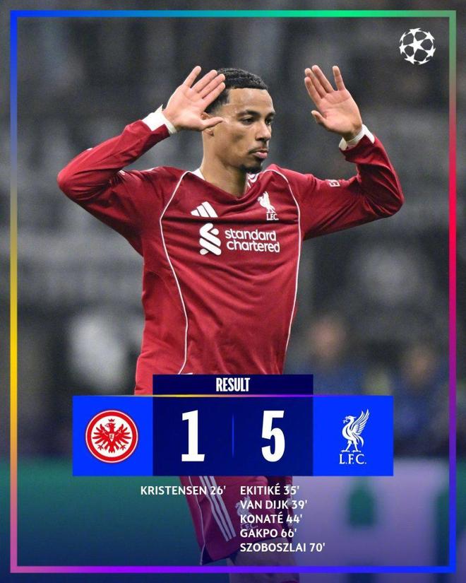 第26分钟克里斯滕森小角度射门得手,主队法兰克福取得领先。第35分钟埃基蒂克面对旧主单刀破门,利物浦追平比分。范戴克和科纳特又先后取得进球,半场利物浦3-1领先。第66分钟加克波门前包抄破门,利物浦将比分改写为4-1。第70分钟索博斯洛伊轰出世界波,比分定格在5-1。