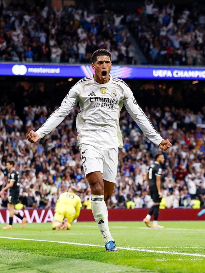 易边再战,第57分钟,威尼修斯禁区内小角度打门击中立柱弹回场内,贝林厄姆火速插上捡漏补射得手,皇马1-0领先,下半场早早就取得了梦幻般开局;值得一提的是,这是身价1.8亿欧的英格兰中场本赛季为皇马打入的处子球,他振臂怒吼疯狂庆祝。