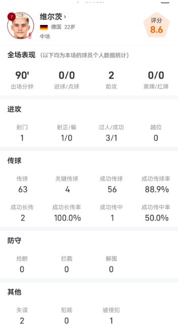 纵观全场比赛,维尔茨在场上首发出场并且打满全场,仅有1次射门并且射正;在场上3次尝试过人其中1次取得成功。维尔茨还有着63次传球,56次成功,其中包括4次关键传球,传球成功率为88.9%。维尔茨还有着2次成功长传,长传成功率为100%;他有着1次成功传中,传中成功率为50%。